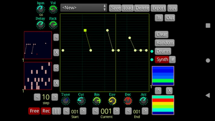 Draw in notes, adjust the sound parameters with knobs, auto create random patterns.