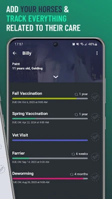 You can add any occasionnal or recurrent task you need to provide to your equine friend such as hoof care, deworming, vaccinations, vet visits or anything else you want: set a schedule and start tracking! You can share your horse's profile to whoever you want and set roles such as : co-owner, trainer or rider (perfect for horses that are half-leased) and manage their permission level.