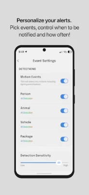 * Events Tagging: Our state-of-the-art AI detects and categorizes specific types of movements, such as people, vehicles, or animals alerting you with relevant information along with a video clip for each event.
