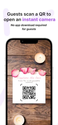 Lense generates a unique QR code with a single tap that you can share with your guests. By scanning the code, they gain instant access to the disposable camera, allowing them to capture, view and download all the beautiful moments. The guests don’t need to download any app to take pictures!