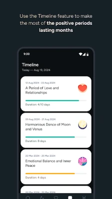 Want to know how long personal astrological influences will last? With our new Timeline feature, you can see how many days astrological influences will impact your life and track how much time remains during this period. Plan each step with the stars guiding you!